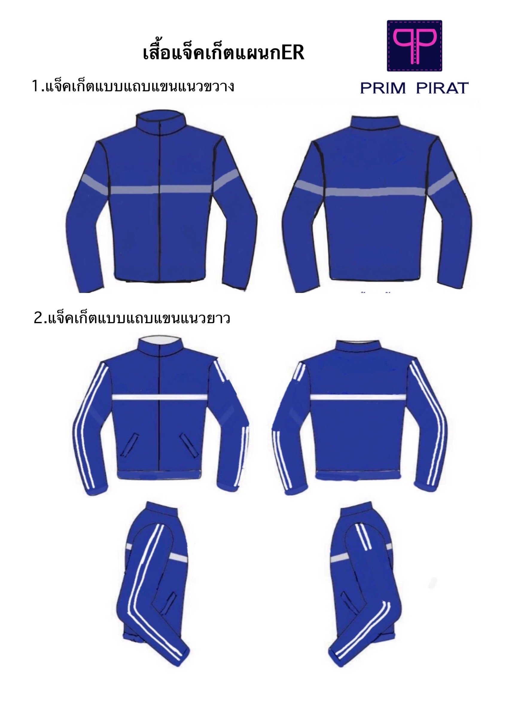 ราคาเสื้อคลุมหรือแจ็คเก็ต เนื้อผ้าSP-รุ่นไม่ติดแถบสะท้อนแสง = 700-รุ่นไม่ติดแถบสะท้อนแสง เพิ่มกุ๊นหรือคัตติ้ง = 800-รุ่นติดแถบ1" หน้าและหลัง = 820-รุ่นติดแถบ 1.5" หน้าและหลัง = 850-รุ่นติดแถบ1" หน้า หลัง และแขน(แถบแขนแนวขวาง/แนวตั้ง) = 850 -รุ่นติดแถบ1.5" หน้า หลัง และแขน(แถบแขนแนวขวาง/แนวตั้ง) = 880 เพิ่มฮู้ดถอดได้ แบบไม่ติดแถบสะท้อนแสง 150-